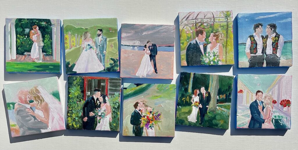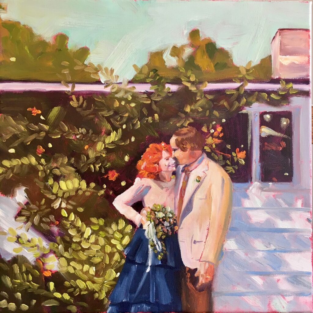 An idea to begin painting MerryMakers couples came shortly after the anniversary painting. I wanted to gift our couples an heirloom for them to have and pass down (that was also personal and fun!). Larissa is given a number of portraits from the wedding photographer, and she chooses what inspires her for each couple! Larissa used to live down the block from me but is in Florida now and I love that we continue the collaboration!